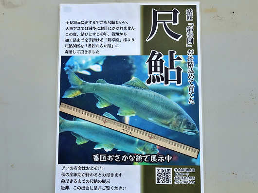 佐伯市街地を過ぎたら「道の駅 やよい」で休憩をしましたが、いつも珍しい魚を展示している番匠おさかな館へ行ってみると、「尺鮎」と呼ばれる30cm以上もある鮎のポスターは貼られていました。尺鮎は食べてみたいとは思いますが、見た目は普通の鮎と変わらないので、今回は入館はパスですね(笑)