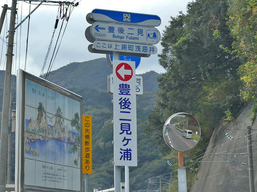 この日は一人だけでのお出かけだったので、ゆっくりとお家を出て海岸沿いの国道217号を走り、海の景色を眺めながら佐伯市上浦までやって来ました。画像は国道から分かれて豊後二見ヶ浦へと続く道の入口ですが、この標識は初めて訪れる人にとっては、見落としてまいそうな位置に立っているのでとても分かり難いんですよね。