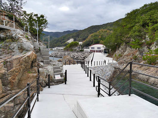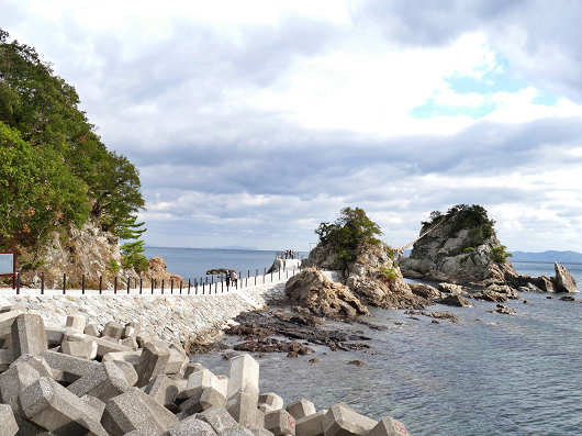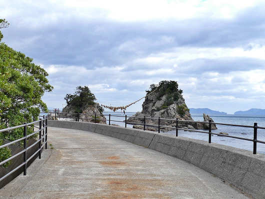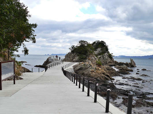 これから新しく完成した遊歩道を歩いてみます。以前は干潮時だけ夫婦岩の手前側の女岩に渡れましたが、干潮で現れた岩場はゴツゴツした岩や海藻で滑りやすい岩だったりと、とても足場が悪くて危険だったんですが、この遊歩道だと安心して女岩まで行けますね。