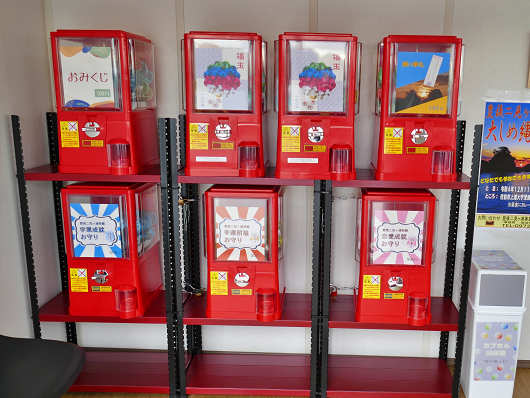 中へ入ってみると数台のガチャが並んでいて、上段の左からおみぐじ 100円、運玉 100円×2、願い事札100円、そして下段は左から学業成就お守り、幸運招福お守り、恋愛成就お守りがそれぞれ500円と書かれていました。