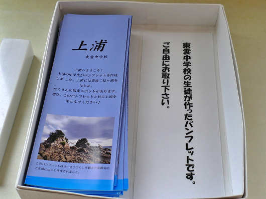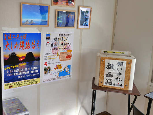 ここには豊後二見ヶ浦のパンフレットもありましたが、東雲(しののめ)中学校の生徒が作ったと書かれていました。この防波堤のすぐ内側にある東雲中学校の生徒は大しめ縄の張替え作業にも関わっているんですよね。