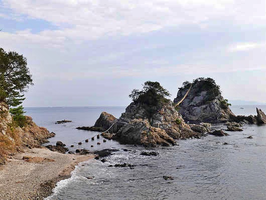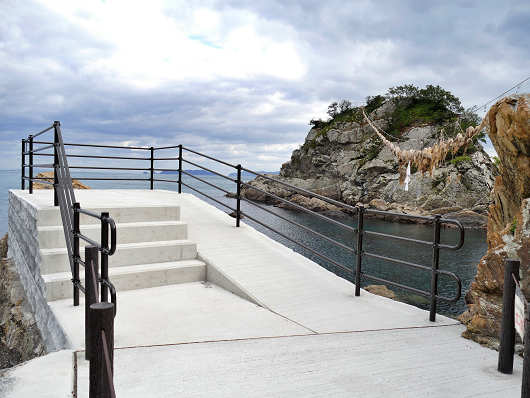 この画像は一昨年ここを訪れた時のものです。夫婦岩と陸地との間には等間隔に立てられた杭のようなものが見えていますが、大しめ縄の張替え時には、この上に仮設の板を渡して作業を行っていて、非常に危険を伴う作業だったので、安全な足場としてこの遊歩道を設置したそうです。