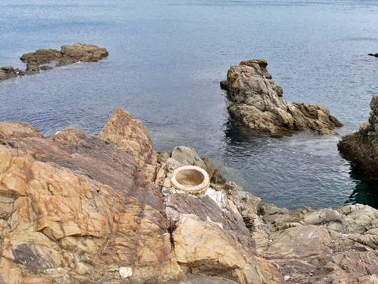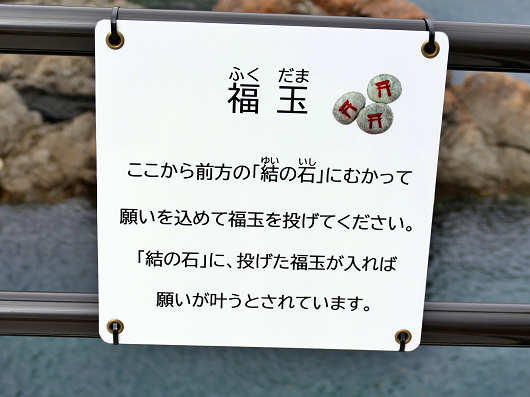 遊歩道の先端部の地面には足形が描かれていて、ここに立って福玉を投げるようでしたが、正面に見える岩場をよく眺めたら丸い壺のようなものがありました。これが「結の石」です。宮崎県の鵜戸神宮では運玉を利き腕じゃないほうで亀石へ投げ入れますが、ここでは利き腕で投げ入れてもいいんでしょうか?(笑)