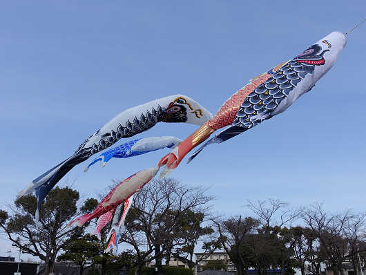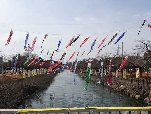 今回は病み上がり(副反応上がり?)ということもあって会場には入りませんでしたが、公園内を歩いていると裏川では鯉のぼりが泳いでいました。「おおいた人とみどりふれあいいち」では初めて見る光景ですが、ウォーキングをしている時に頑丈なポールを立てる工事をしていたのはこのためだったんですね。