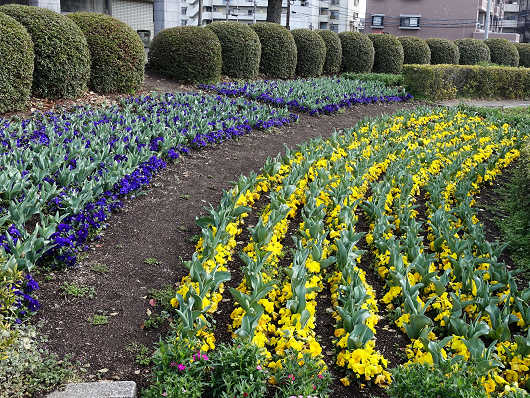 公園内を廻ってカラクリ時計がある花壇へ行ってみると、ここにはたくさんの花が植えられていました。画像はチューリップの間に植えられた花で、チューリップはまだ咲いていませんでしたが、このチューリップが花を咲かせる頃には、気温もぐっと上がってきて春本番の陽気になるでしょうね。