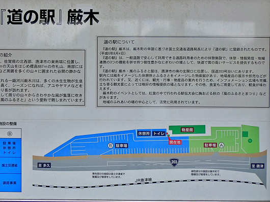 国道203号へ出るとすぐに佐賀県唐津市厳木町の国道203号沿いにある道の駅「厳木(きゅうらぎ)」の標識が見えてきたのでここに車を停めましたが、「厳木(きゅうらぎ)」って初めてこの漢字を見た人はまず読めないでしょうね(笑)