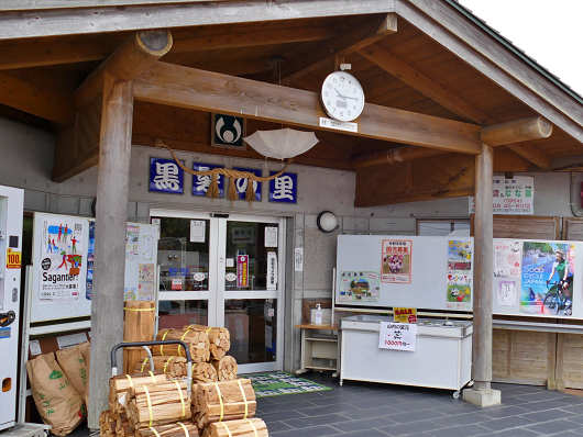 駐車場に車を停めたら物産館へと入りましたが、入口には「黒髪の里」と看板が掲げられていました。そして看板の上には何故か逆さまに開いた傘が吊るされていました。もしかしたらこの上にはツバメの巣でもあるんでしょうか?(笑) 館内は農産物売り場とお土産品などの売り場とに分かれていましたが、農産物売り場に以前はお食事処があったようでした。