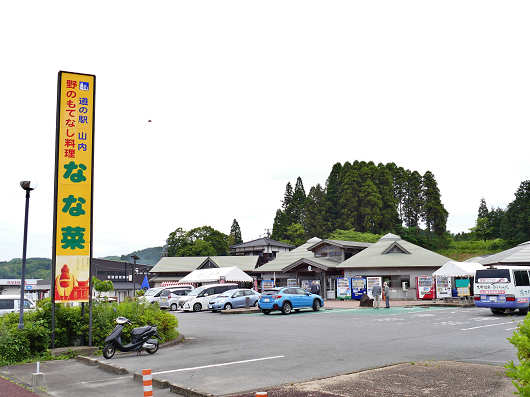 道の駅「山内」の全景です。ここは物産館の裏手にも駐車場があって、普通車58台と大型車3台が停められる比較的小規模な道の駅です。大きな看板には「野のもてなし料理 なな菜」と書かれていますが、これはこの道の駅に最近まであったお食事処で、今は閉店して営業をしていません。