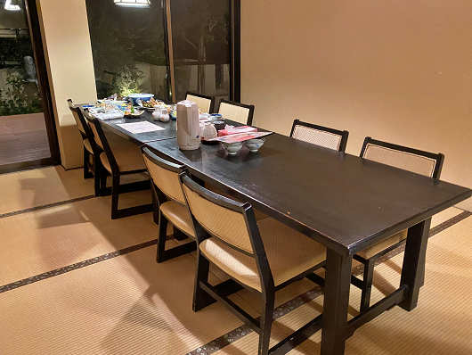 案内された席は8人用のテーブル席でした。料理の一部はすでにテーブルの上に置かれていましたが、テーブルの広さは余裕たっぷりで、これだけ広い空間だと密の心配が全く無くて安心して食事ができますね。