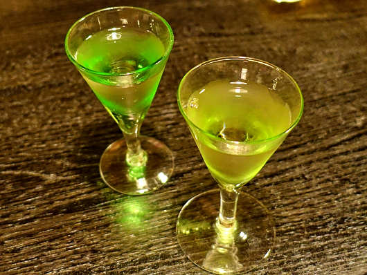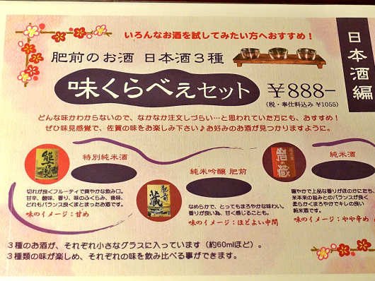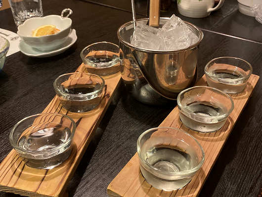 味くらべぇセットはどちらも同じように見えますが、左が日本酒の味くらべぇセットで、手前から甘口、中間、辛口の特別純米酒、純米吟醸酒、純米酒でした。そして焼酎は手前から芋焼酎・角玉、芋焼酎・魔界への誘い、米焼酎・おおちでした。