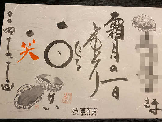 料理の下に敷かれていた紙には宿泊客の名前が書かれていて、こういった細かなサービスも嬉しいですね。