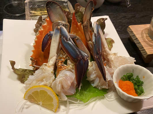 蟹の刺身です。カニポン酢と刺身醤油で食べましたが、足の付け根にはたっぷりのカニ肉が付いていたのでかなり食べ応えがありました。