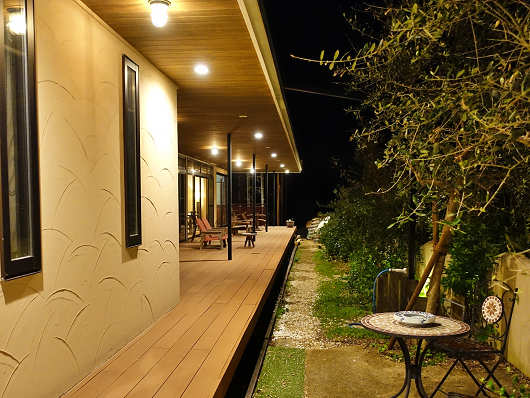 夜のお食事処を外から見たらこんな感じです。画像に写っているのはオープンテラスの「ゆらり」ですが、その左側にお食事処があって、食事が終わったらそのままオープンテラスへも出れるので、食後にここで星空や遠くの夜景を眺めながらコーヒーを飲むのもよさそうですね。