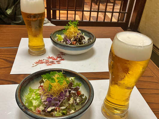 席に座ったらさっそく料理の注文です。いつもならお腹いっぱい飲み食いをするところですが、翌日は早朝の4時30分頃までにはホテルをチェックアウトをする予定で、軽く食べたらホテルへ戻って早々と眠るので、料理は二人で数品だけを注文しました。