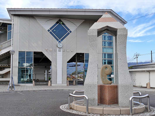 吉野ヶ里町の中心部まで来るとJR長崎本線の「吉野ケ里公園駅」が見えてきましたが、駅前広場には遺跡の町 吉野ケ里を象徴するように勾玉のモニュメントがありました。今夜のお宿はこのすぐ近くなんですよね。