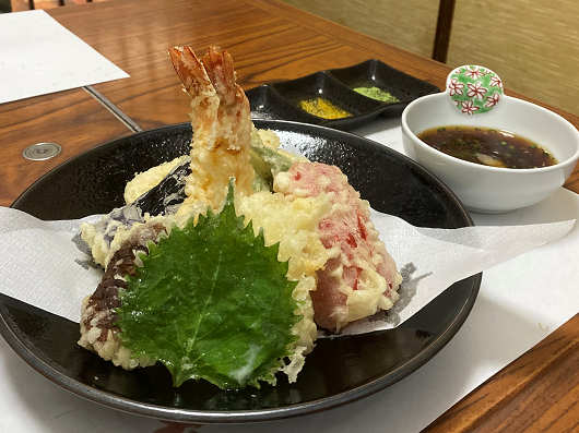 次に運ばれてきたのは天ぷら盛り合わせです。このお店は基本が天婦羅屋さんなので、エビ、キス、野菜などの天ぷらは衣がサクサクで、中身は適度な火の通り具合で絶品といえるほど美味でした。
