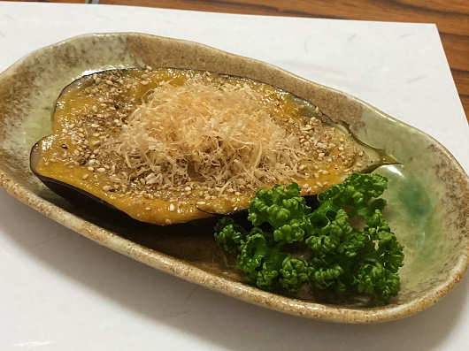ベーなすの田楽です。とっても大きなナスで、二人で半分に分けて食べましたが、これだけでかなりお腹に溜まりました。