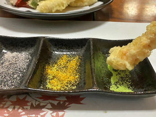 天ぷらには天つゆと3種の塩が付いていましたが、カラッと揚がった美味しい天ぷらには塩が一番ですね。