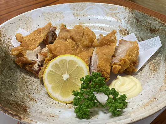 鶏の唐揚げです。モモ肉の開きを一枚のまま揚げてからカットしていましたが、油っこさを全く感じなかったのはさすがに天ぷら屋さんですね。