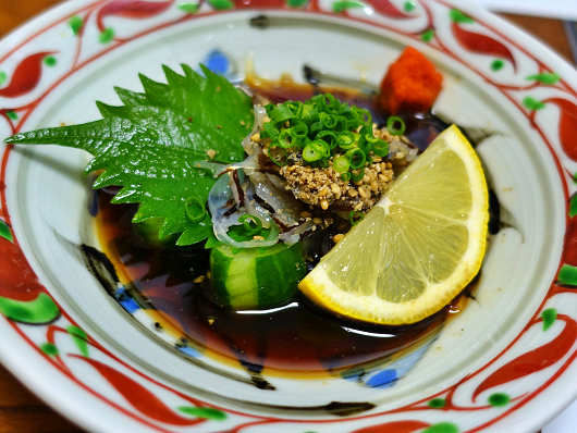 クラゲ酢です。油ものを食べた後にさっぱりしたものをと思って注文しましたが、天ぷらも唐揚げも油っぽさを感じなかったので必要なかったような感じでしたが、コリコリした食感はお酒の肴には最高でした。