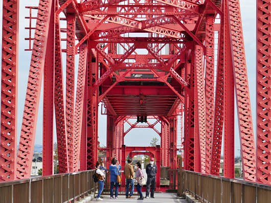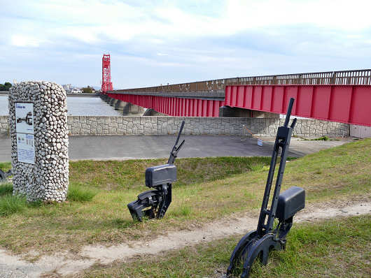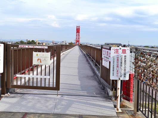 これから歩いて「築後川昇開橋」を渡ります。橋の入口には扉があったので夜間などは閉まっているんでしょうね。