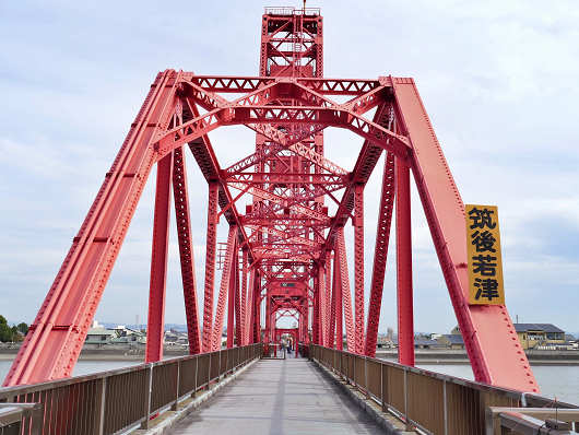 築後川昇開橋は全長が507mほどありますが、中央付近にある可動部が近づいてくると「筑後若津」と書かれた看板が鉄骨に掲げられていました。橋を渡った先は福岡県大川市で、かつて筑後若津駅があったそうです。