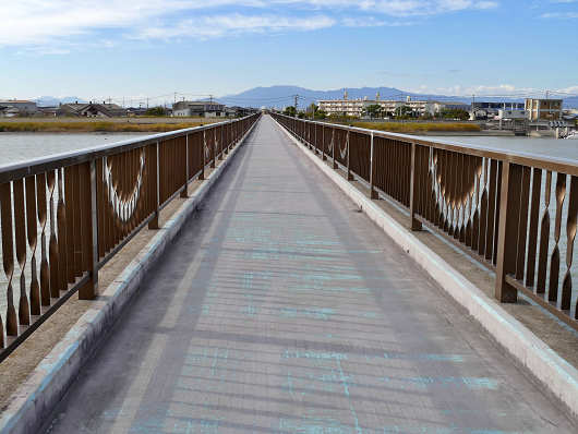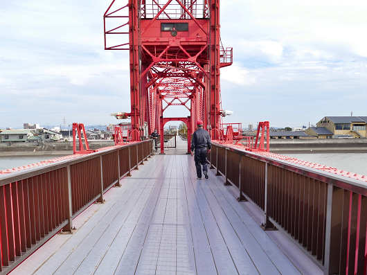 築後川昇開橋は観光客の有無によって、定時の昇降以外にも作動させてくれるそうで、この時は私たちのために2度ほど可動部を昇降させてくれたので、福岡県側へ少しだけ入ってまた戻りました。本当は対岸まで行きたかったんですが、橋の真ん中あたりからでも岸まではこの距離ですから、戻ることを考えたら大変ですからね。