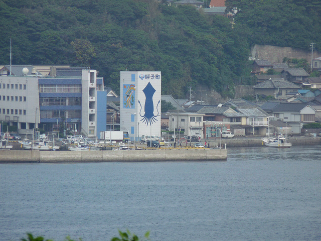 呼子大橋を渡りきった加部島側の駐車場からは呼子の町がよく見えました、さすがにイカが有名な呼子らしく大きなイカの絵が建物に描かれていました。