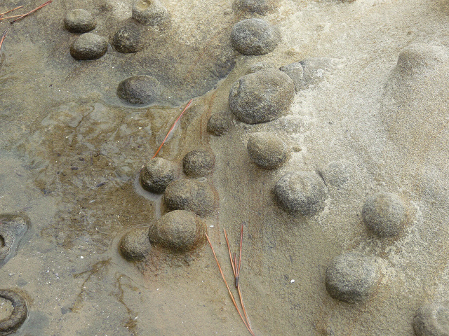 不思議な形をした岩があったよ、卵くらいの大きさの岩がいっぱいくっついていました。