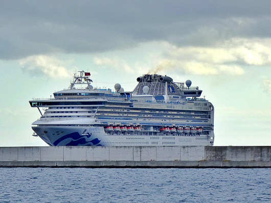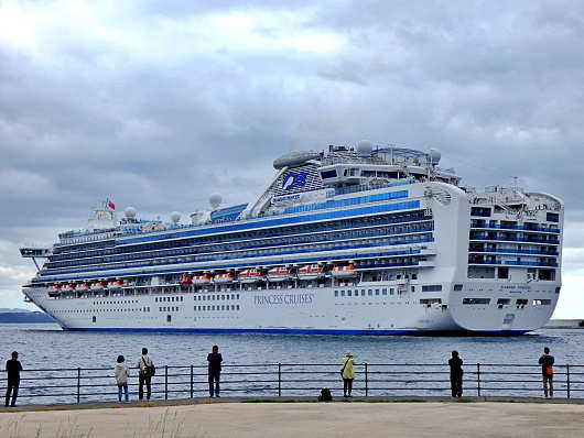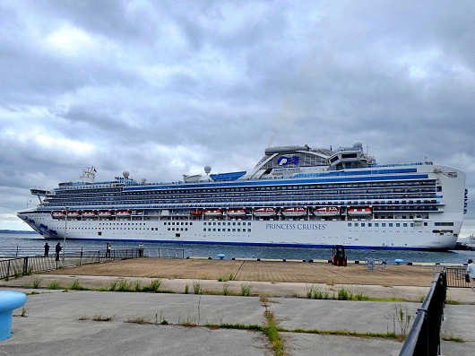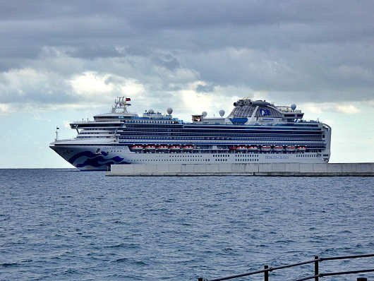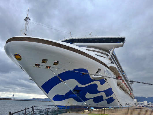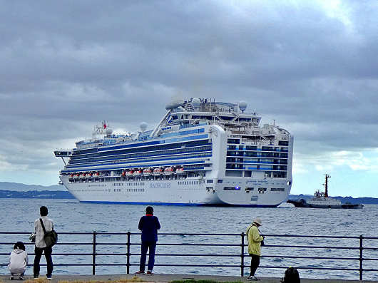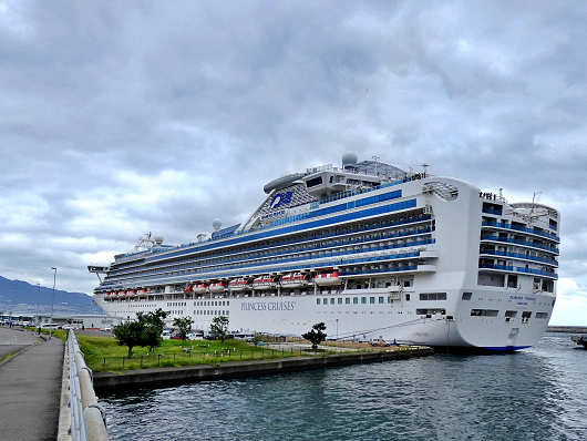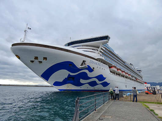 クルーズ船は間もなく沖の防波堤を廻って入港します。この日別府国際観光港へ寄港したのは、アメリカのプリンセス・クルーズ社が運航する「ダイヤモンド・プリンセス」です。この船は数年前に航行中の船内で新型コロナの集団感染が発生して、海上にて船内隔離を行ったことで世界的にも話題になった船です。