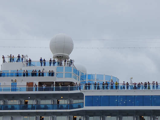 船上では多くの乗船客が入港風景を眺めていました。この船には客室が1337室もあって、旅客定員が2706名、乗員が1238名で合わせると4000名ほどの人員になるので、小さな自治体の人口よりも多くの人が乗船していることになるんですよね。ちなみに大分県でいちばん小さな自治体は東国東郡姫島村で人口は1500人余りなので、まるでひとつの村が移動しているって感じですね(笑)