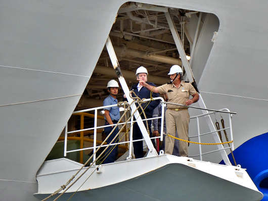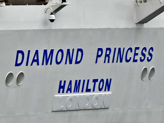 後進でゆっくりと港内へ入ってきたダイヤモンド・プリンセスは間もなく接岸です。このクルーズ船はイギリスの会社が所有していて、アメリカの会社によって運航されている船ですが、建造されたのは三菱重工長崎造船所なんですよね。