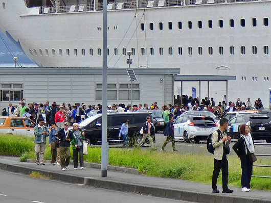 接岸作業が終わると続々と乗船客が降りてきましたが、ほとんどが日本人のような感じでした。近くに停まっていた移動用のバスを見ると、フロントガラスにはJTBなど国内旅行会社の文字が見えたので、今回の寄港は日本人向けの国内ツアーのようですね。