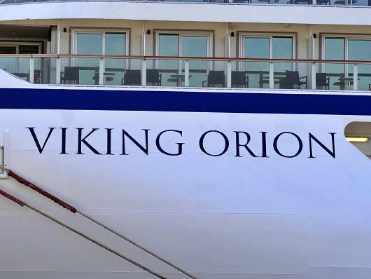 船名のバイキング・オリオンの文字の下には、船籍のあるノルウェーの都市のベルゲンと書かれていました。外国のクルーズ船はバハマやマルタなど税金の安い国を船籍国とすることが多いんですが、この船の船籍国はちょっと珍しいですね。しかもこの船を所有する会社が海の無い内陸国のスイスにあるのも面白いですね。