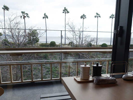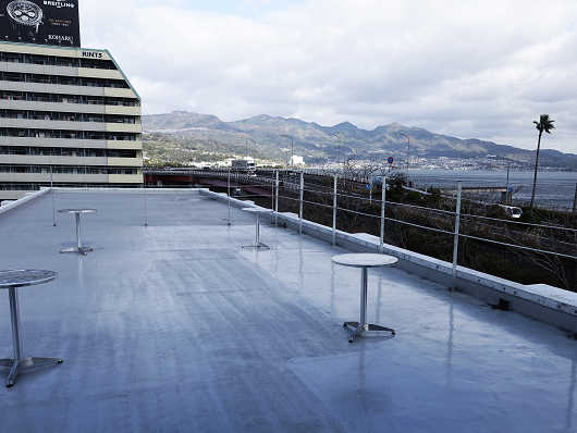 屋上には展望デッキがあって、ここからは別府湾が一望できました。この時は北風が吹いてとても寒かったので誰もいませんでしたが、気候のいい時季には別府湾を眺めながらお茶をするのも良さそうですね。
