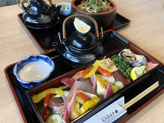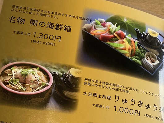 席へ案内されたらさっそく料理の注文です。私は地元テレビで何度も紹介されていた名物「関の海鮮箱」を、そしてりゅうママは大分の郷土料理の「りゅうきゅう丼」を注文しました。