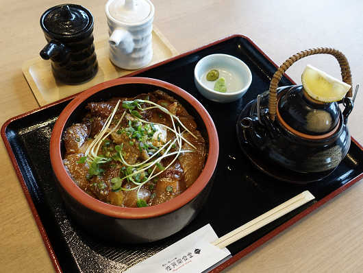 りゅうママの注文したりゅうきゅう丼には新鮮なブリの漬けが、ご飯が全く見えないほど乗っていて、りゅうママは半分ほどをワサビ醤油をかけて食べ、残りの半分は土瓶蒸しの出汁をかけてお茶漬けにして食べました。