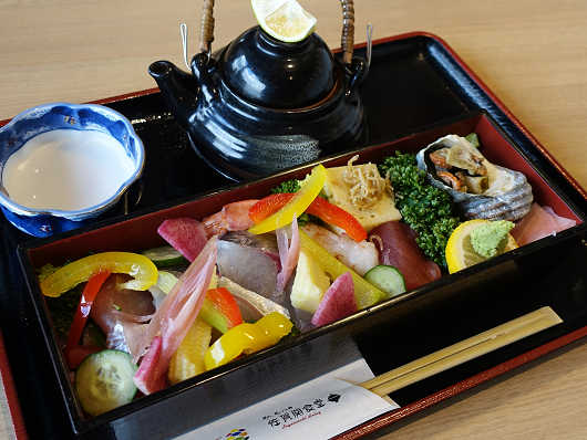 私の注文した名物「関の海鮮箱」です。ご飯の上にはカラフルな野菜がたくさん乗っていて、見た目はとてもきれいでしたが、海鮮類はどこにあるの?って感じがしましたが・・・