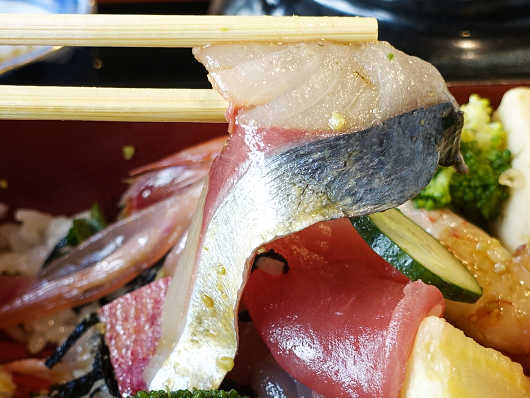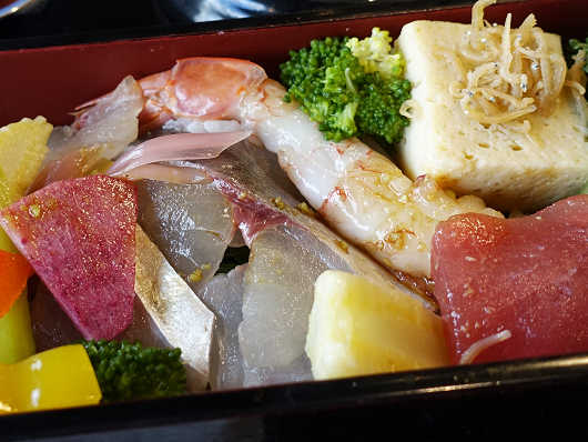 上に乗っている野菜を食べたら、下からはご飯が見えないほどびっしりと敷き詰められた魚やエビが出てきて、とても豪華な海鮮ちらしでした。
