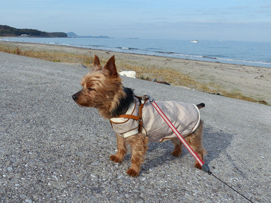 今度は海岸へやって来ました、高い展望台から降りてほっとしたのか?それとも潮の香りが気持ちいいのか?りゅう君は目を細めて満足そうな顔をしています、