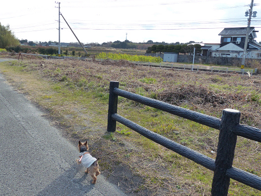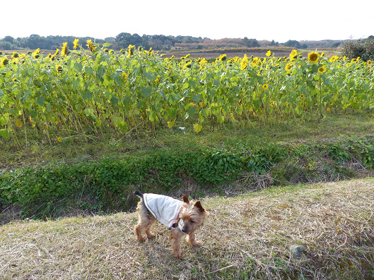 海岸沿いの遊歩道からちょっと中に入ると先のほうには今日の目的のヒマワリが見えてきました、