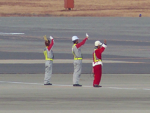 これから離陸しようとする飛行機を眺めてたら、整備の人たち?が飛行機に向かって手を振ってたんだけど右端の人の服装はどう見てもサンタクロースなんだけど・・・