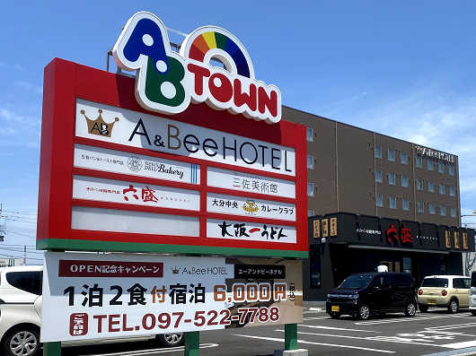 「A&Beeホテル」 の敷地内には飲食店が数店舗入っていて、ホテルを中心とする 「ABタウン」 と名付けられた複合施設になっています。最初の画像には店舗名の書かれた看板が写っていますが、今回テイクアウトする 「田べり」 は、ホテル内に併設のお食事処なので、この看板には店名が書かれていません。