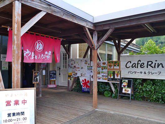 左側の赤い暖簾がかかっているところが温泉施設の「やよいの湯」の入口です。そしてその奥には白い扉が見えていますが、ここはパンケーキ&クレープの「cafe Rin(カフェ リン)」です。