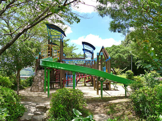 番匠おさかな館の横には子供用遊具などの設置された一角もあります。ここは緑も多くて小さな池などもあるので、子供連れで訪れてもゆっくりと遊ぶことができます。
