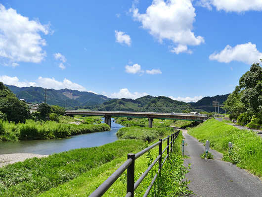 屋外の休憩所を通り抜けて道の駅の裏手へ出ると、とてもきれいな清流の井崎川が流れています。この辺りは親水公園のようになっていて、水深も浅いのでこれからの季節は水遊びもできそうでした。そして画像に写っている橋の上は国道10号で、井崎川はそのすぐ先で大分県一の清流といわれる番匠川と合流しています。