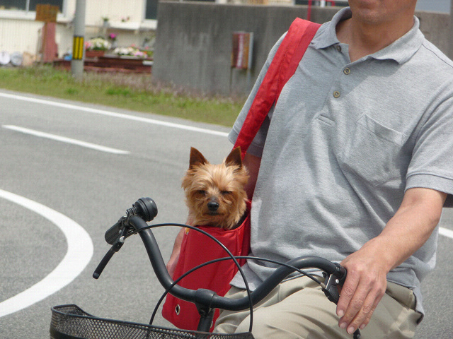 僕はパパにバッグごと担がれて自転車で移動です、とっても楽ちんだよ、でも眠たいなぁ、