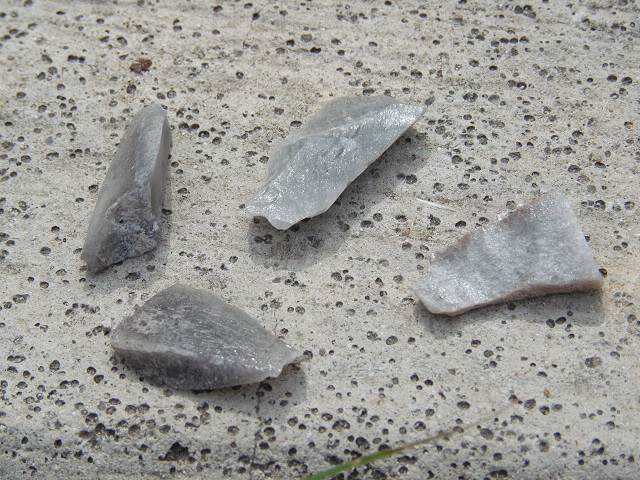 そんな貴重な黒曜石ですが、地面を見たら普通の石ころのようにたくさんのかけらがころがっていました、数個拾って撮影してみたら、こんな形をしていました、それぞれの辺が鋭利に割れていて非常に硬く矢じりや刃物代わりに利用されていたのも納得です。