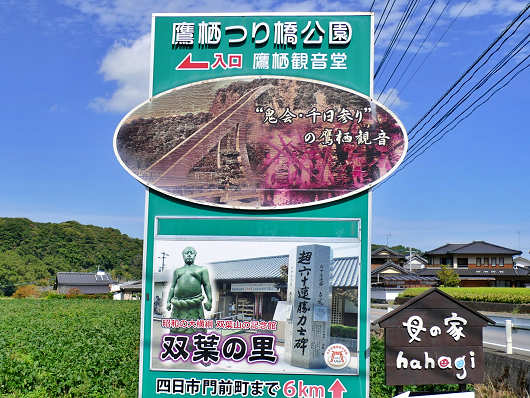 里の駅・双葉の里からは国道10号 ⇒ 国道387号と走って、宇佐市の街中を抜けると「鷹栖つり橋公園、鷹栖観音堂」と書かれた看板が見えてきたので、ここを右折して公園の駐車場に車を停めました。