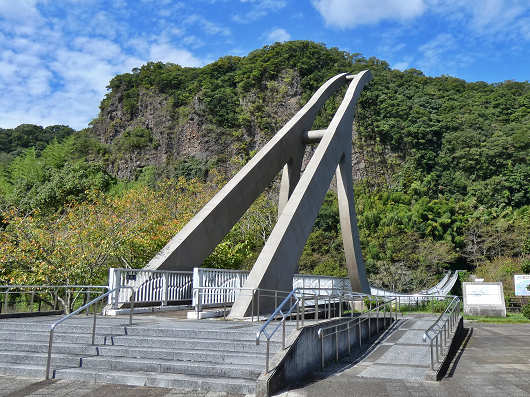 鷹栖観音堂へは「鷹栖つり橋」を渡りますが、この吊り橋は歩行者専用の吊り橋で、支柱の形は鷹が対岸の岩壁にある巣へ向かって飛び立つ姿、或いは観音堂に向かって人が合掌している姿をイメージしているそうです。